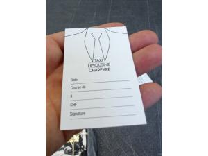 Format : 8.5 x 5.5 cm Papier : Couché demi mat 350g Impression : Couleurs Recto Pelliculage : Sans Pelliculage Découpe coins : Coins carré Perforation : Sans Perforation